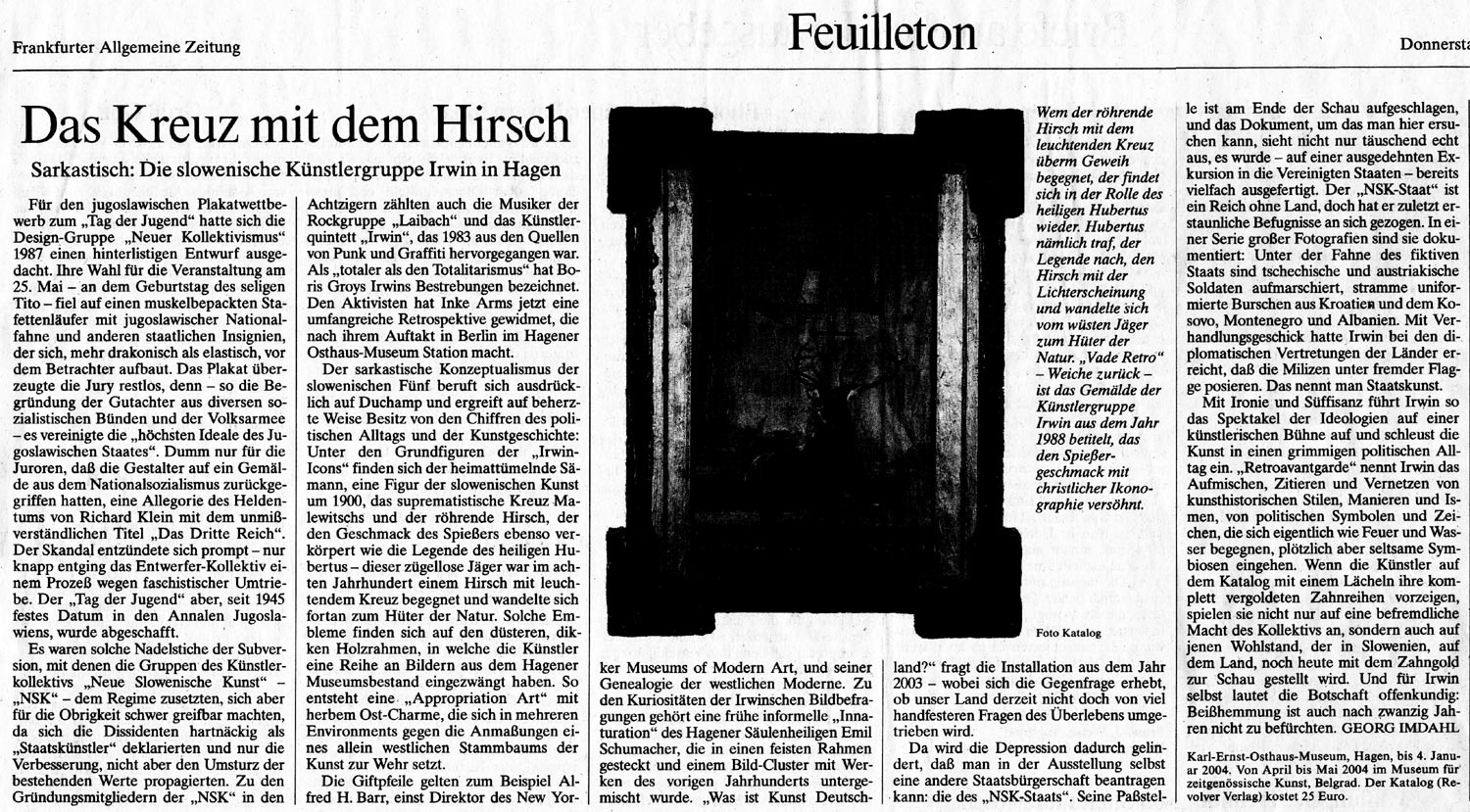 Georg Imdahl: Das Kreuz mit dem Hirsch. Sarkastisch: Die slowenische Künstlergruppe Irwin in Hagen, in: Frankfurter Allgemeine Zeitung, 18.12.2003