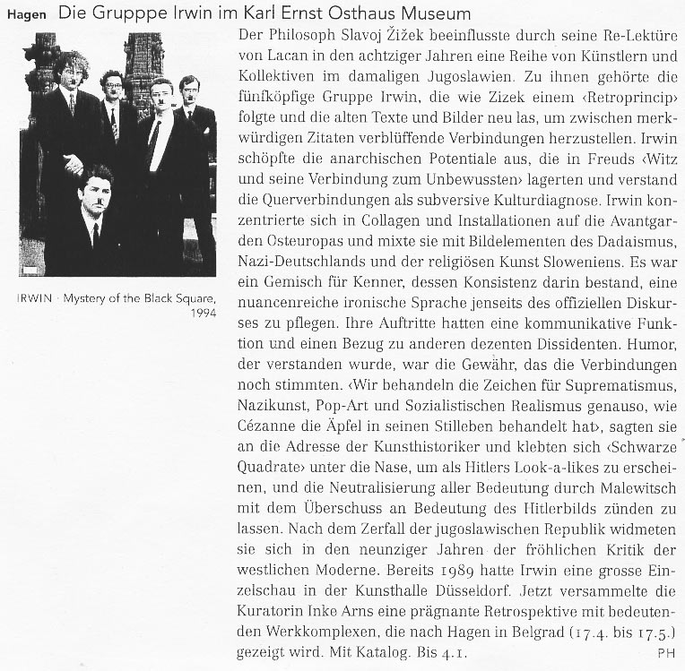 | Die Gruppe Irwin im Karl Ernst Osthaus-Museum, in: Kunst-Bulletin (CH), Nr. 12, 2003, S. 62 |