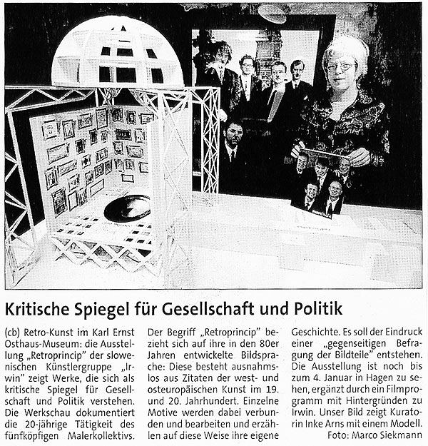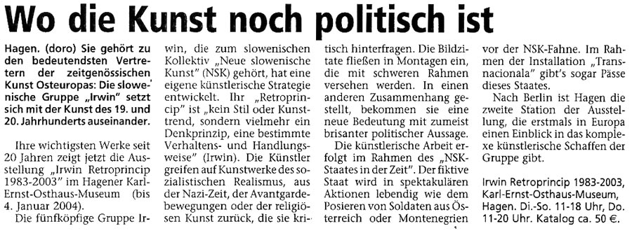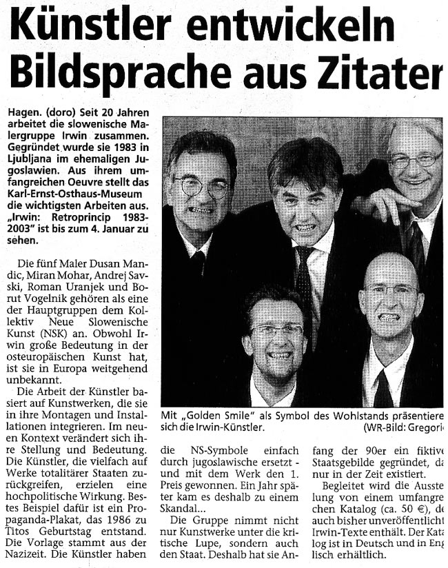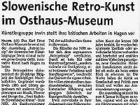 | (cb): Slowenische Retro-Kunst im Osthaus-Museum. Künstlergruppe Irwin stellt ihre kritischen Arbeiten vor, in: Westfalenpost (Mantel), 15.11.2003 |