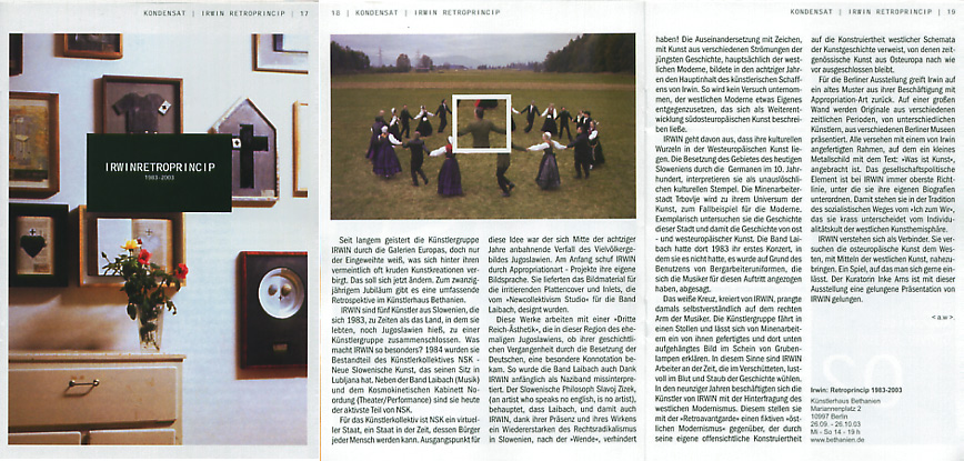 (a.w.): Irwin Retroprincip 1983-2003, in: Kondensat (Berlin), Nr. 24, Oktober 2003, S. 17-19