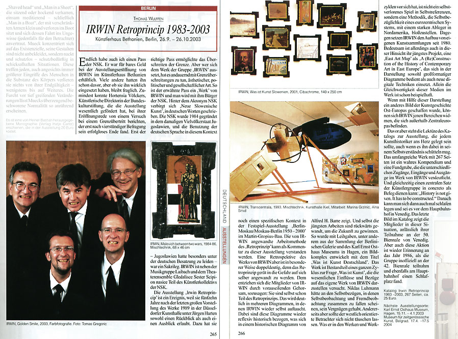 Thomas Wulffen: Irwin Retroprincip 1983-2003, in: Kunstforum International 11/12 2003, S. 265-266 |