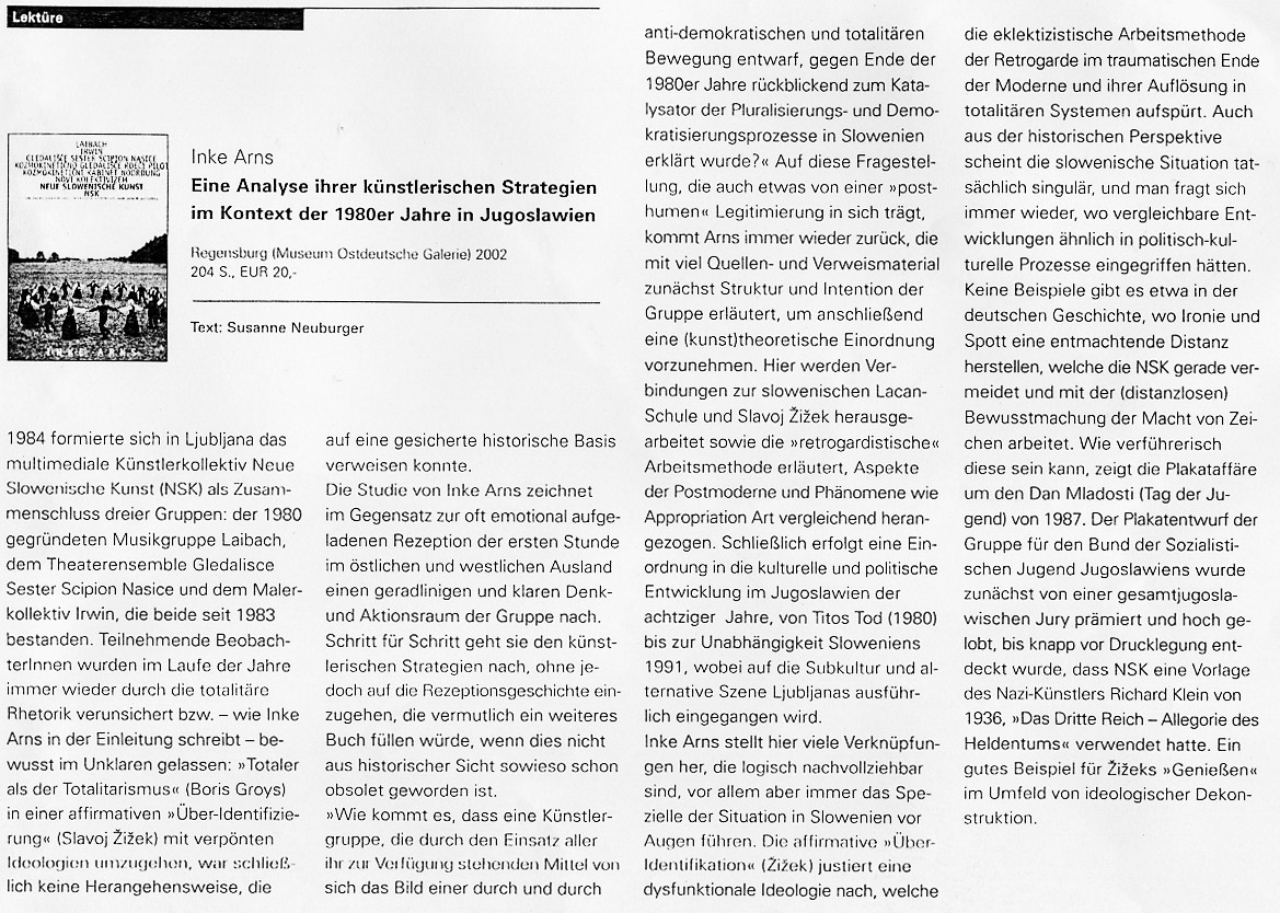 Susanne Neuburger: Neue Slowenische Kunst – Eine Analyse ihrer künstlerischen Strategien im Kontext der 1980er Jahre in Jugoslawien, in: springerin, Nr. 4/2003, S. 77