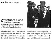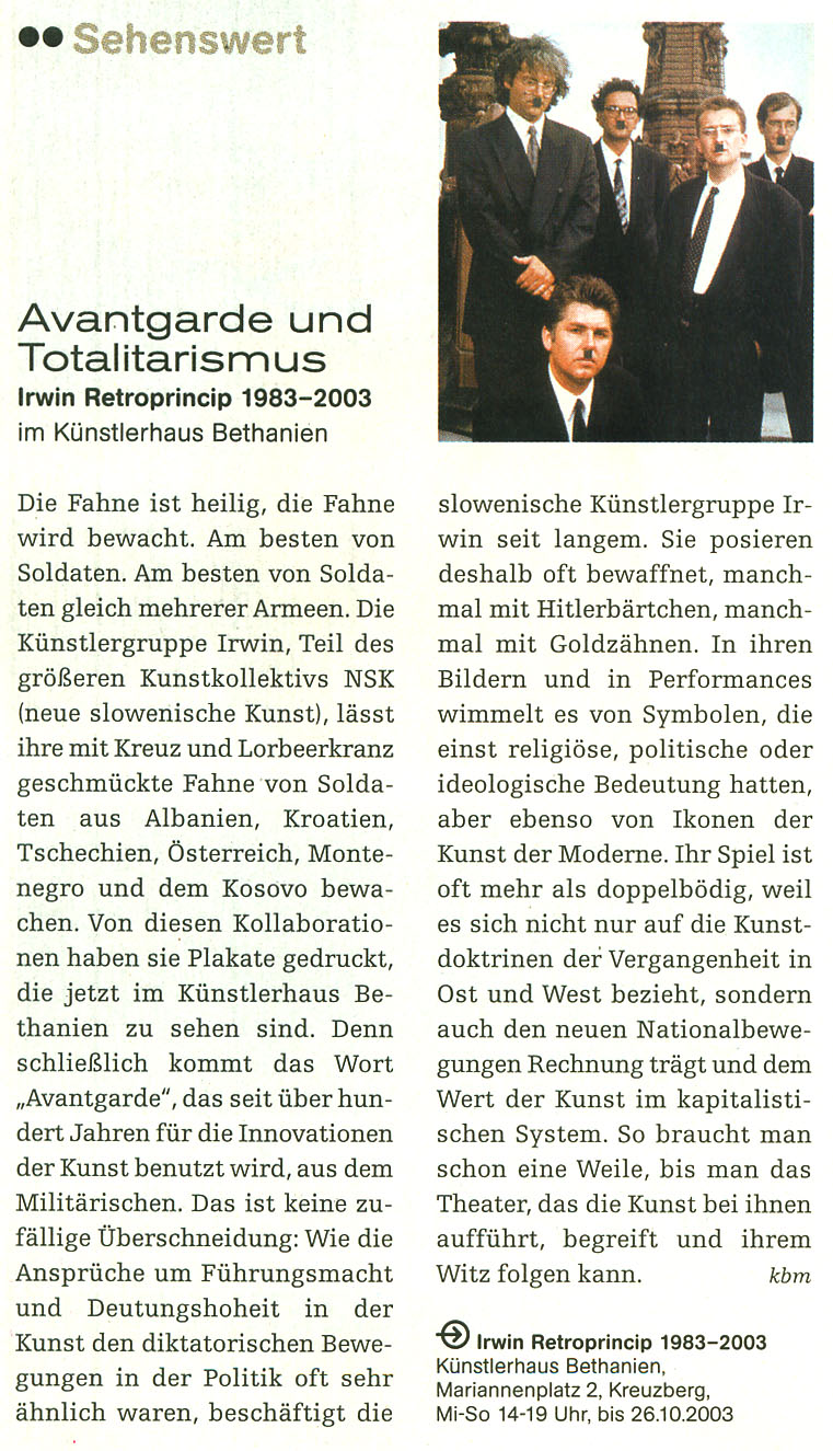 Alexander Tišma: Miks oprecnih ideologija. Izloba slovenacke grupe „Irvin” u Muzeju savremene umetnosti u Beogradu, in: Dnevnik online (Novi Sad), 28. April 2004