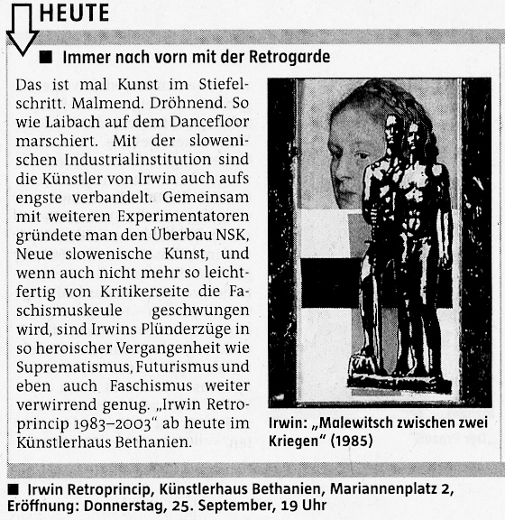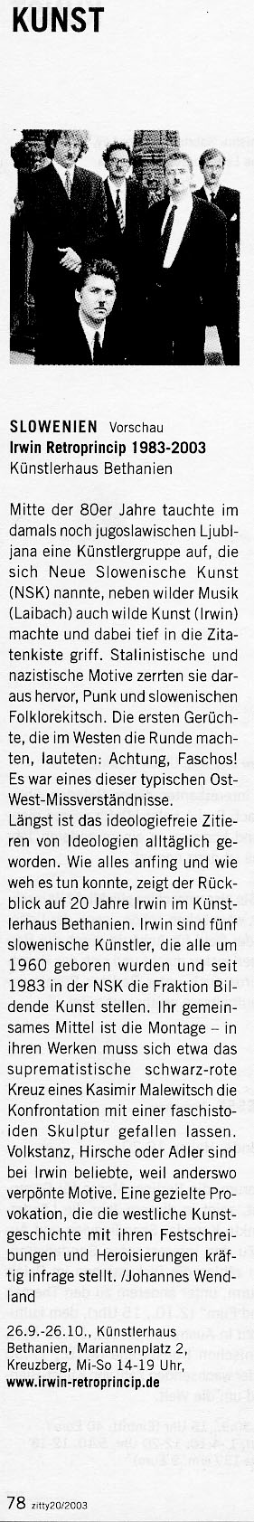 Johannes Wendland: Irwin Retroprincip 1983 – 2003 (Vorschau), in: Zitty (Berlin) 20/2003, S. 78